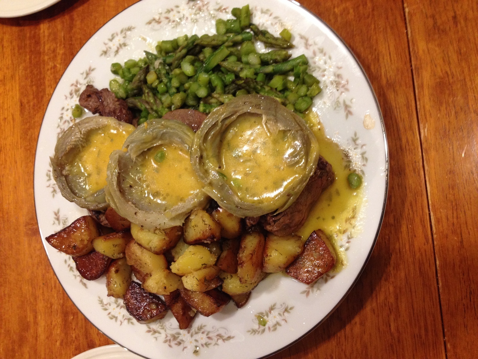 Tournedos Henri IV (filet steaks with artichoke bottoms and béarnaise sauce); asparagus tips