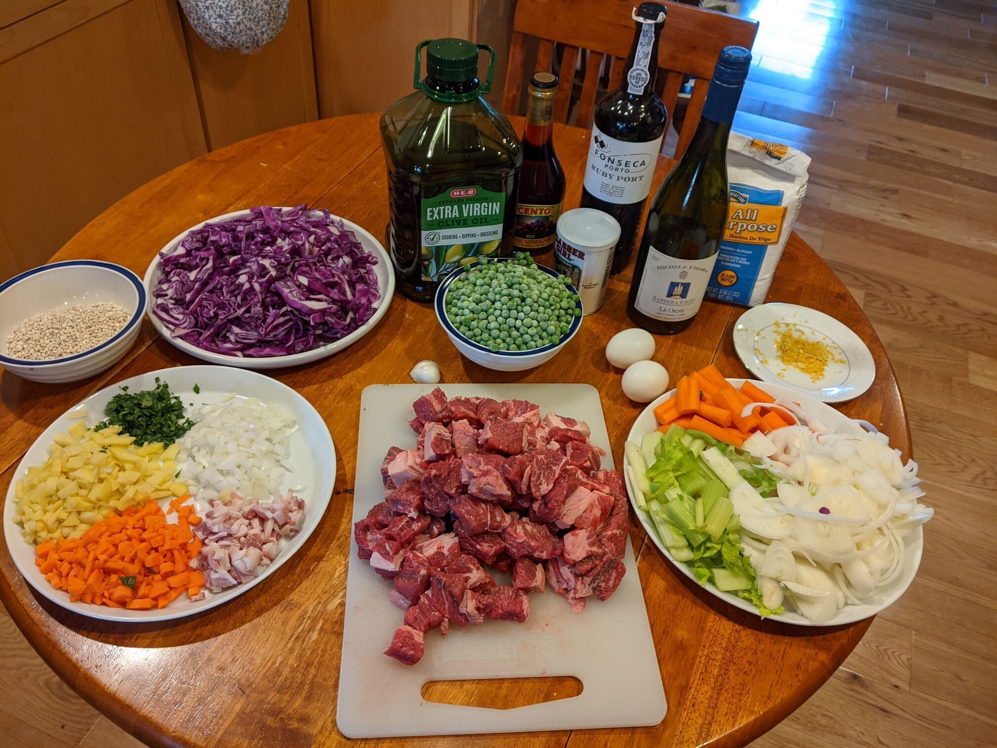 Trentini barley soup; beef stew with red wine and vegetables; red cabbage; olive oil cake