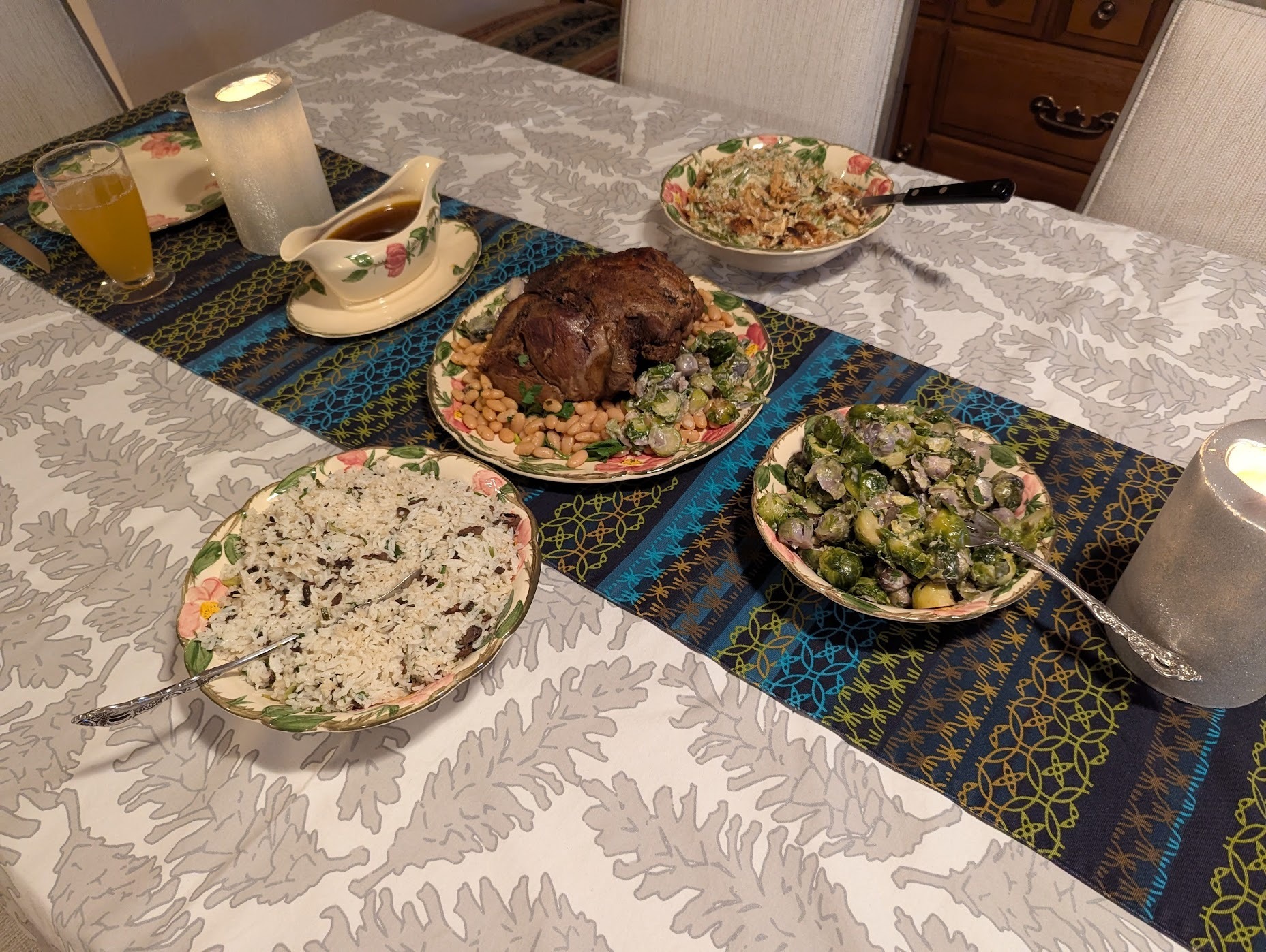 Braised leg of lamb with white beans; creamed brussels sprouts; green bean casserole; rice with mushrooms