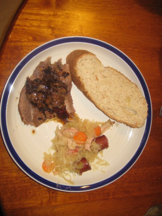 Roast goose with prune and liver stuffing; choucroute