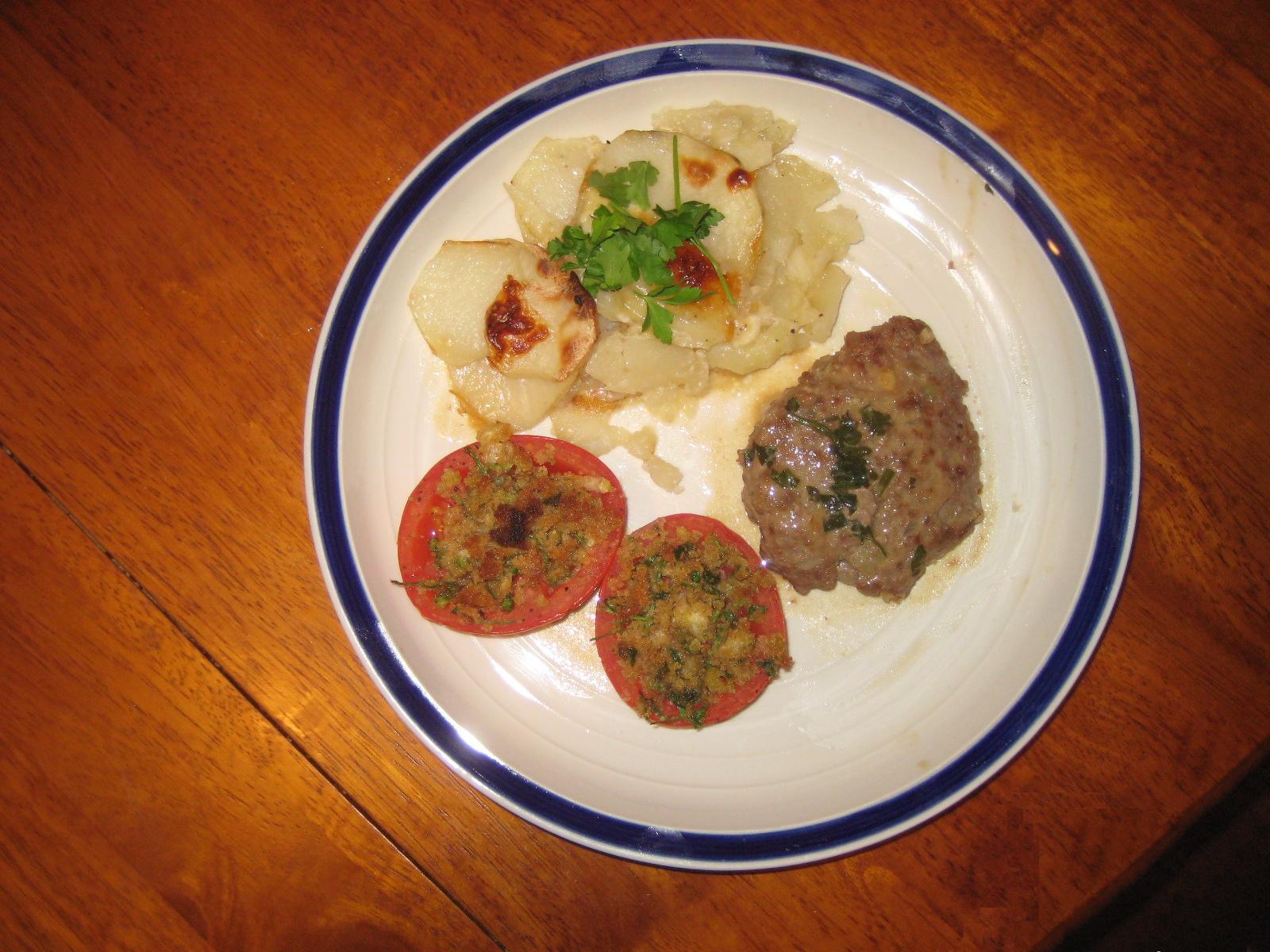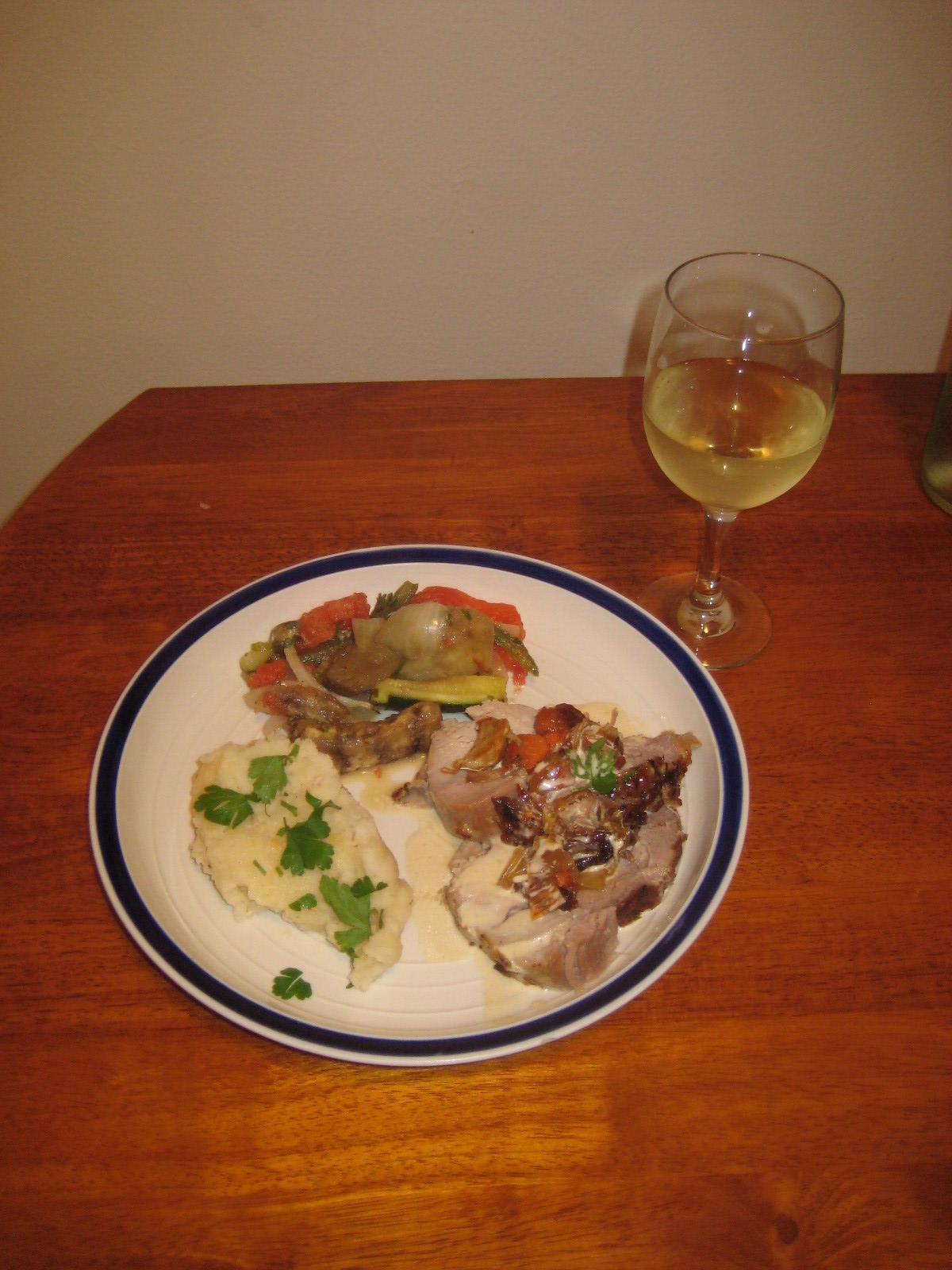 Roast pork with mustard cream sauce; ratatouille; garlic mashed potatoes