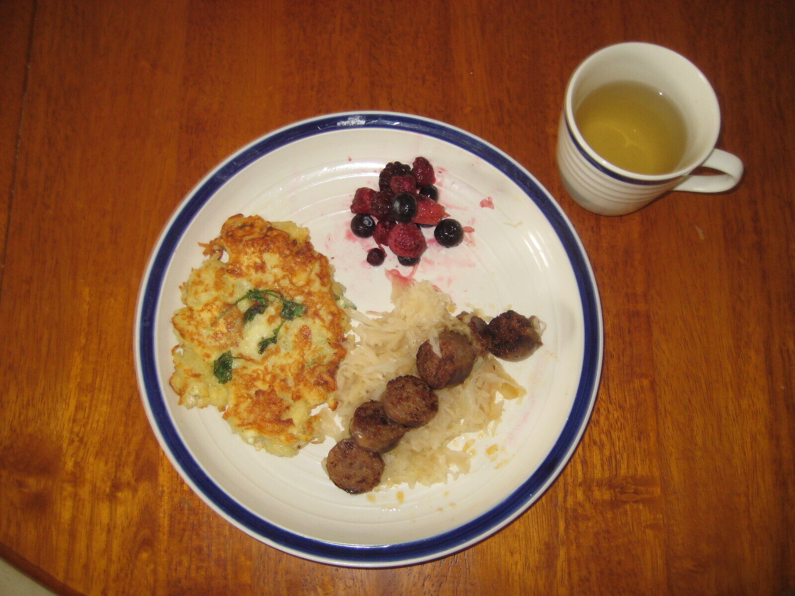Potato pancake; sausage with sauerkraut; assorted berries