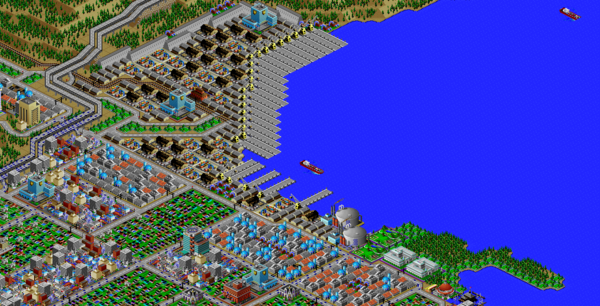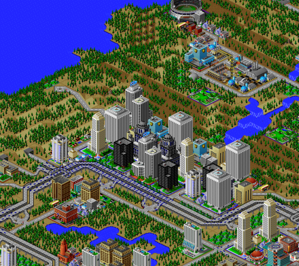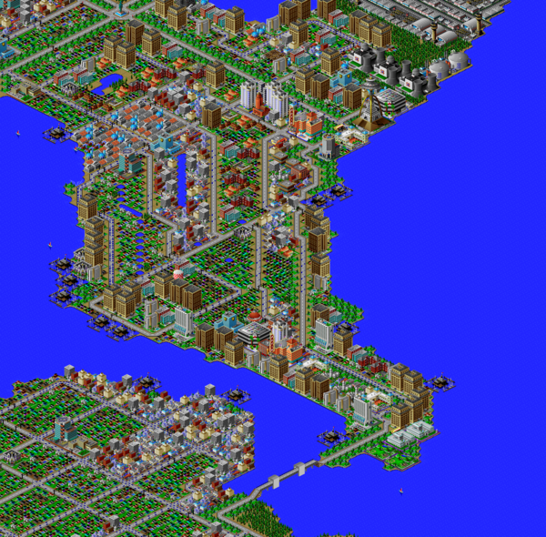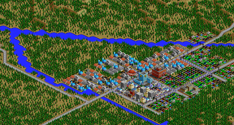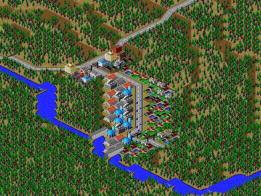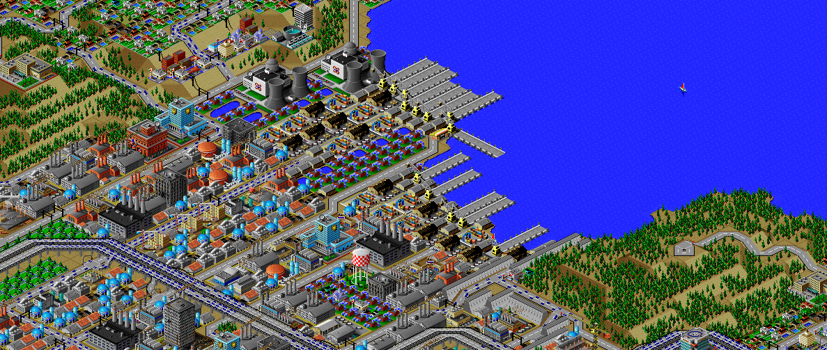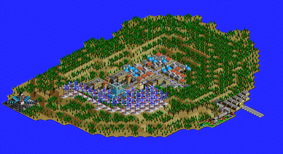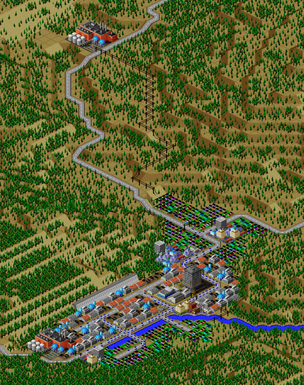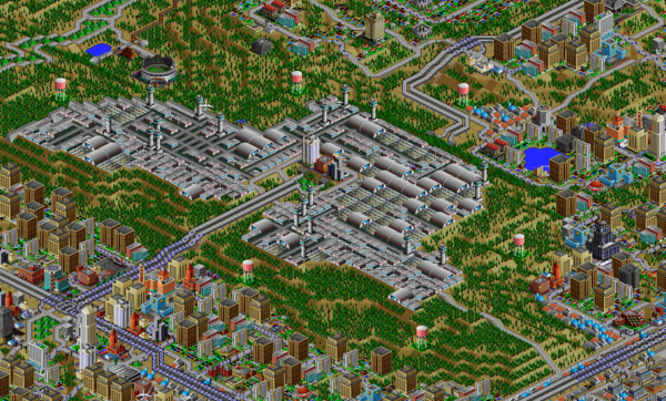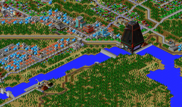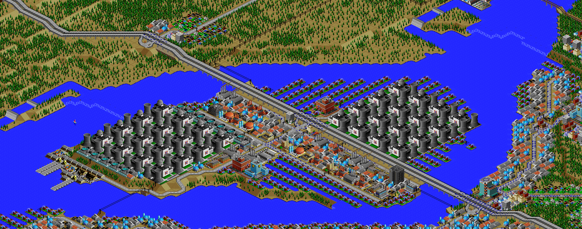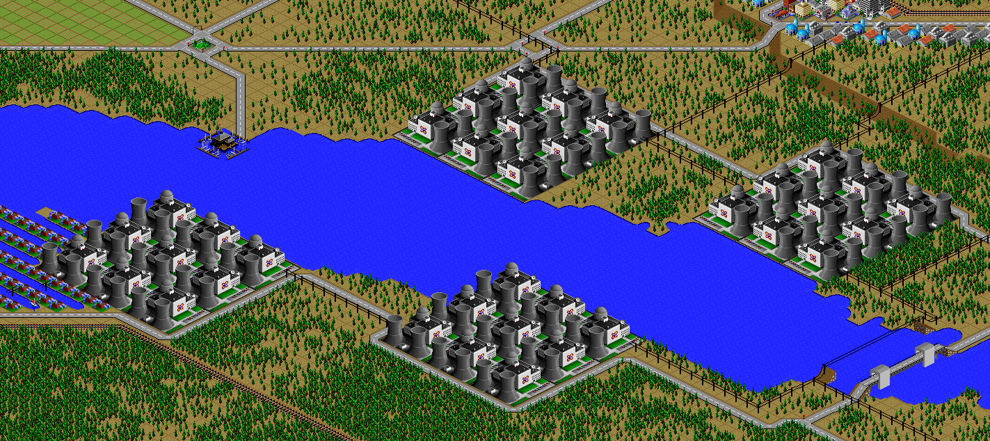 SimCity 2000 doesn't allow you to transfer power between cities, and so I've done some "cheating" with hydro plants (see Simulator Tricks for more detail), but I've made sure that there are enough "real" power plants to provide electricity to all 81 cities in the set, and mega-plants like this are a key part.