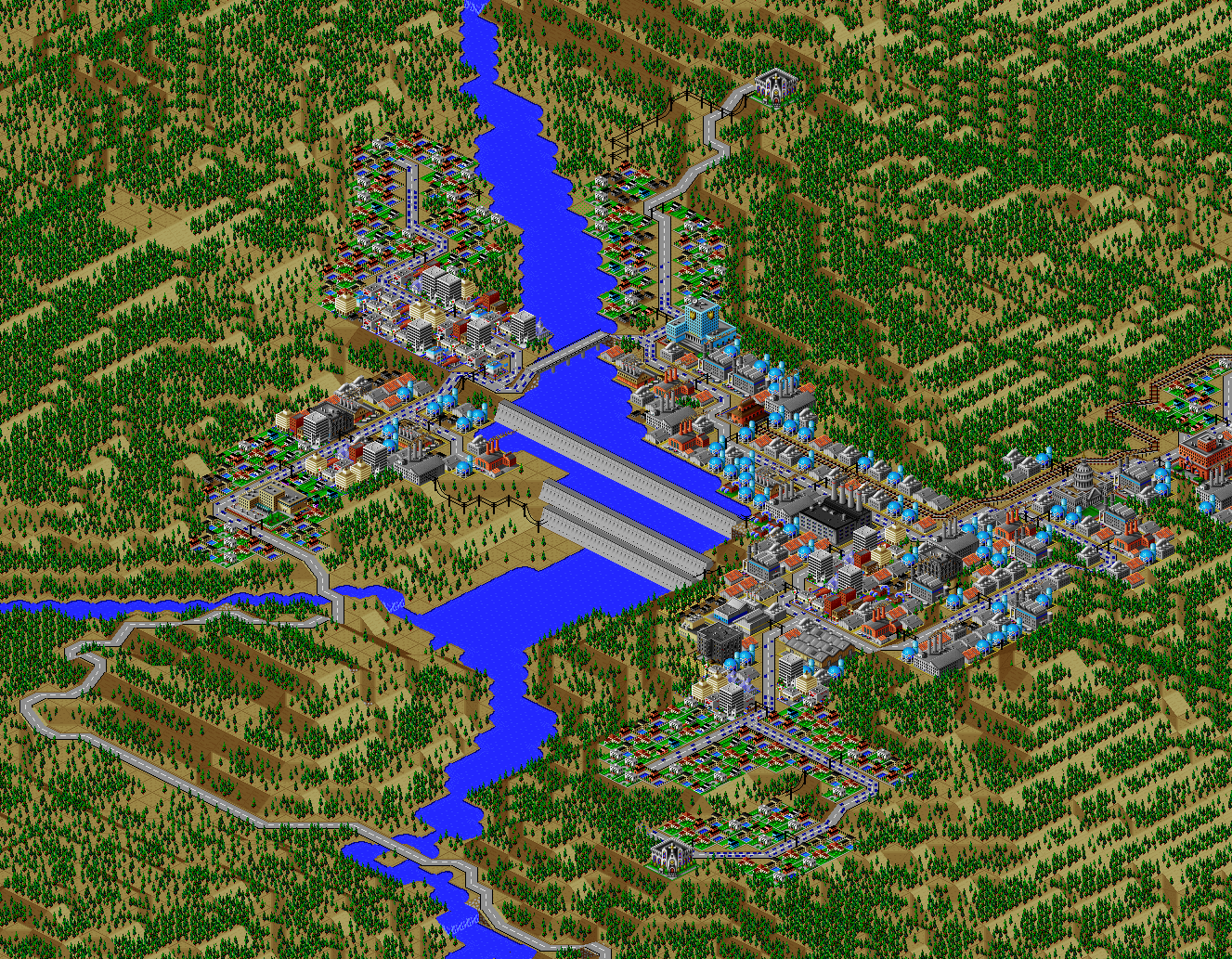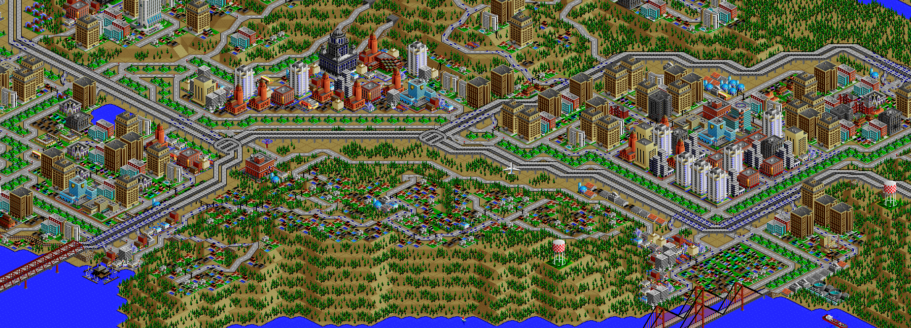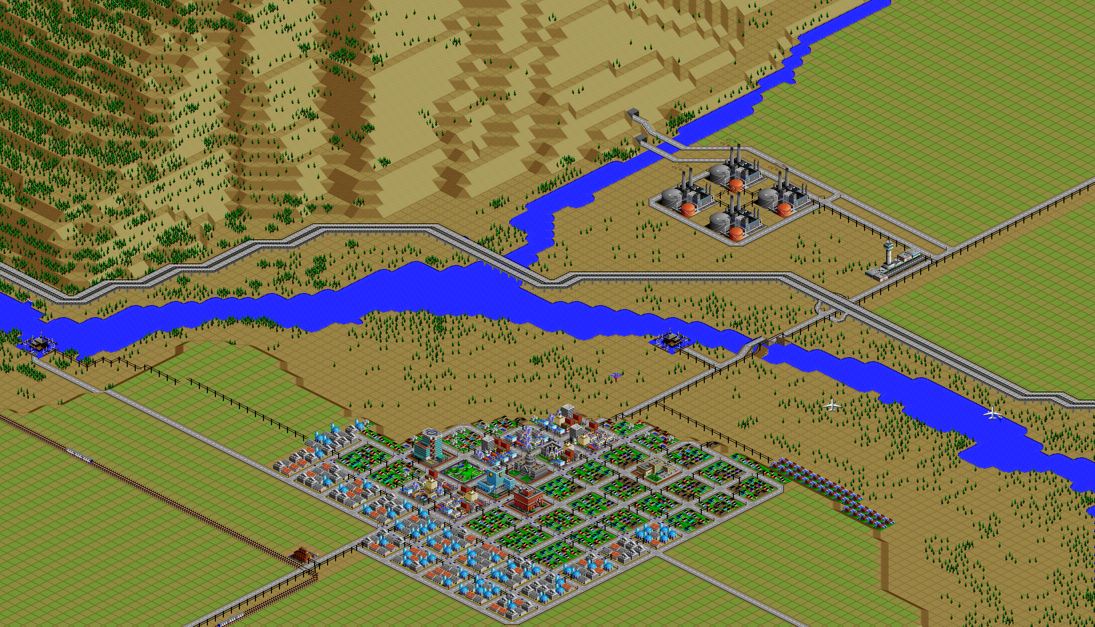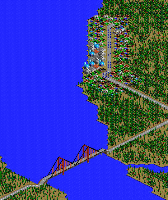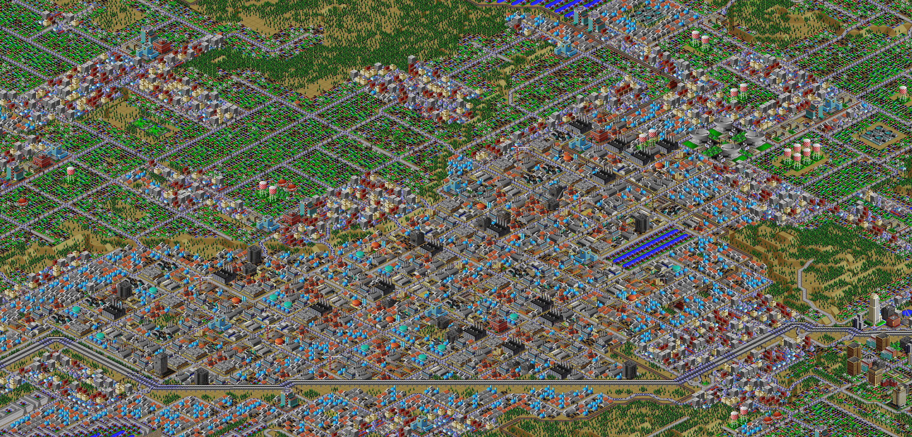 SimCity 2000 doesn't allow you to transfer power between cities, and so I've done some "cheating" with hydro plants (see Simulator Tricks for more detail), but I've made sure that there are enough "real" power plants to provide electricity to all 81 cities in the set, and mega-plants like this are a key part.