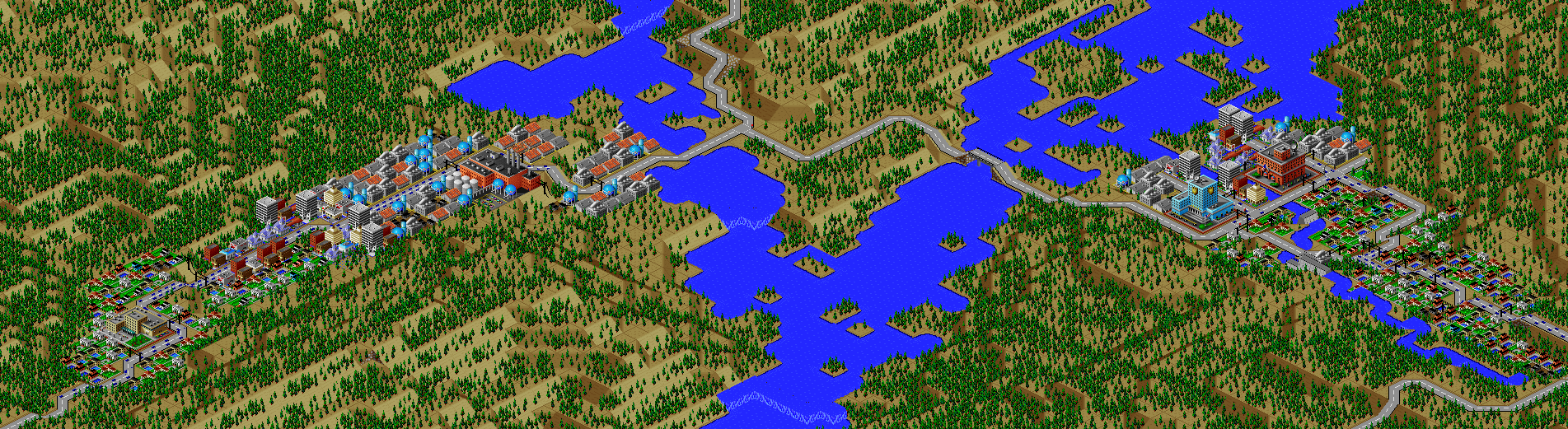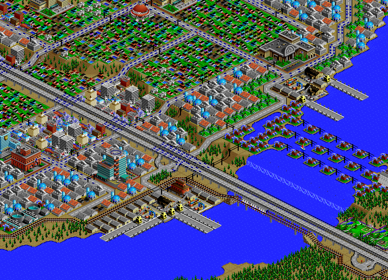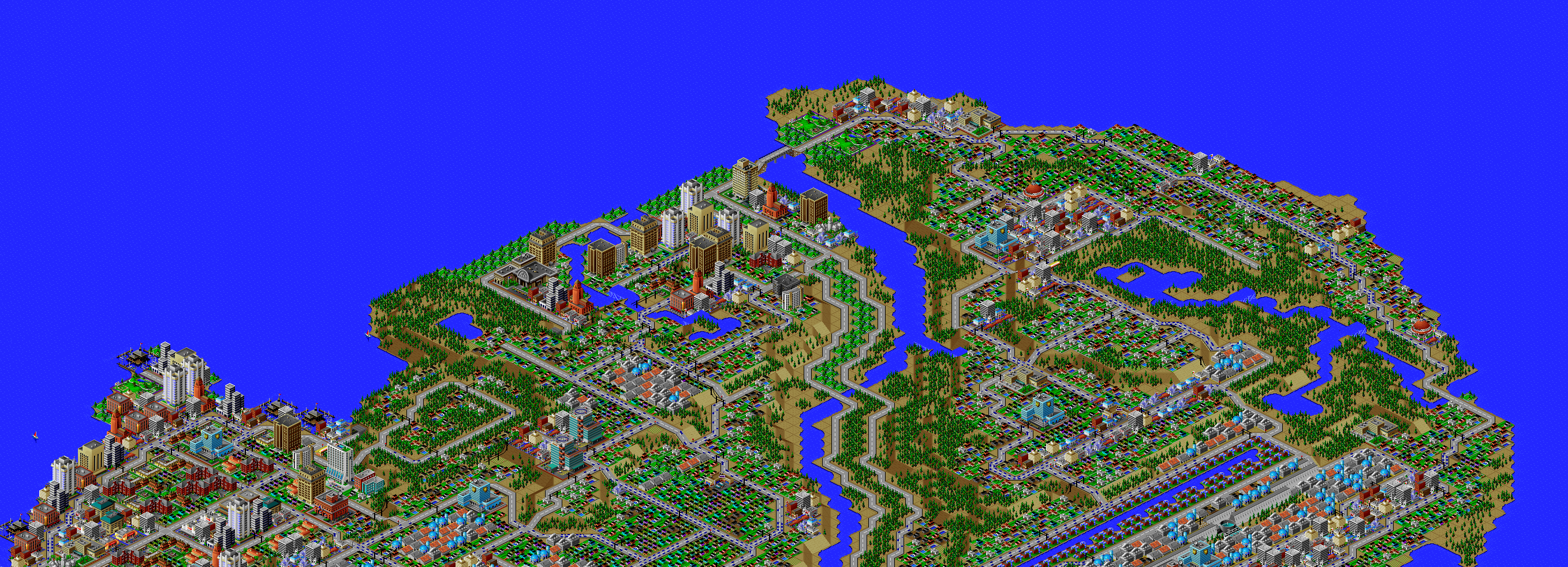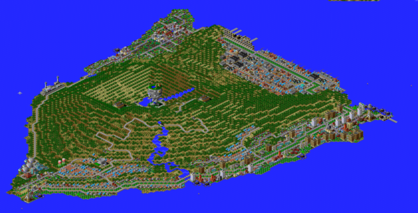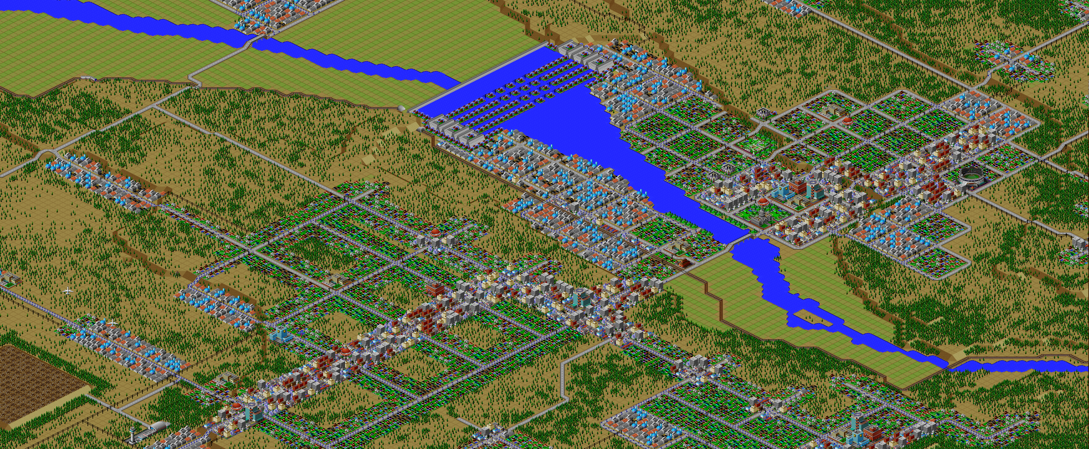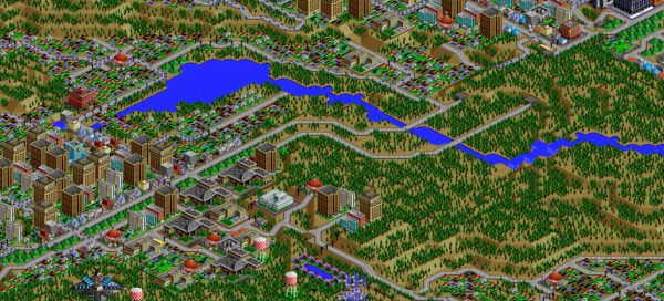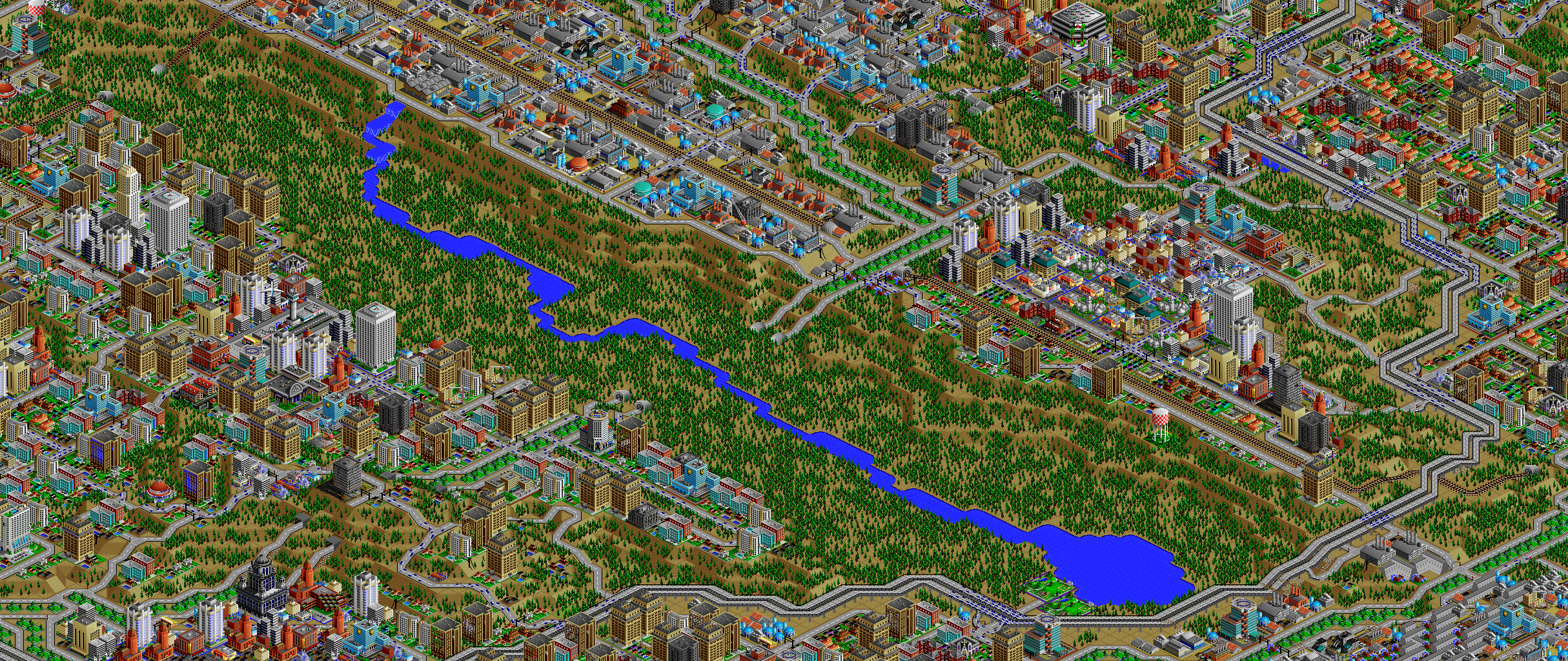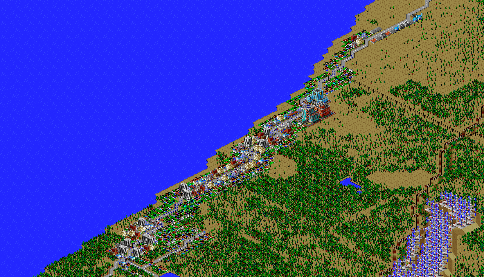 SimCity 2000 doesn't allow you to transfer power between cities, and so I've done some "cheating" with hydro plants (see Simulator Tricks for more detail), but I've made sure that there are enough "real" power plants to provide electricity to all 81 cities in the set, and mega-plants like this are a key part.