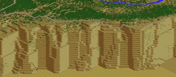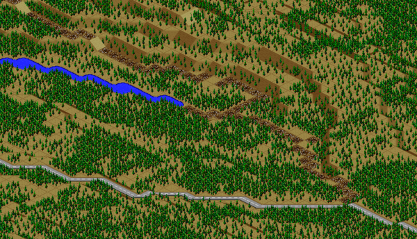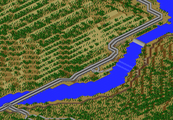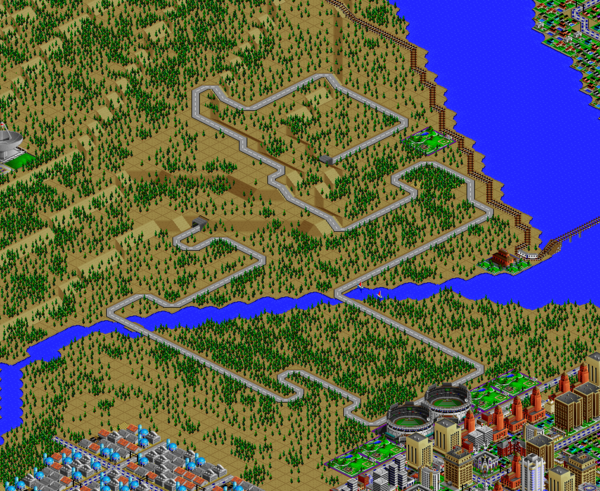 You can see a cliffside stadium for the baseball team at the top of the diagram, and a dual-bore freeway tunnel to the left; I again use the subway trick to curve these tunnels to the north.
